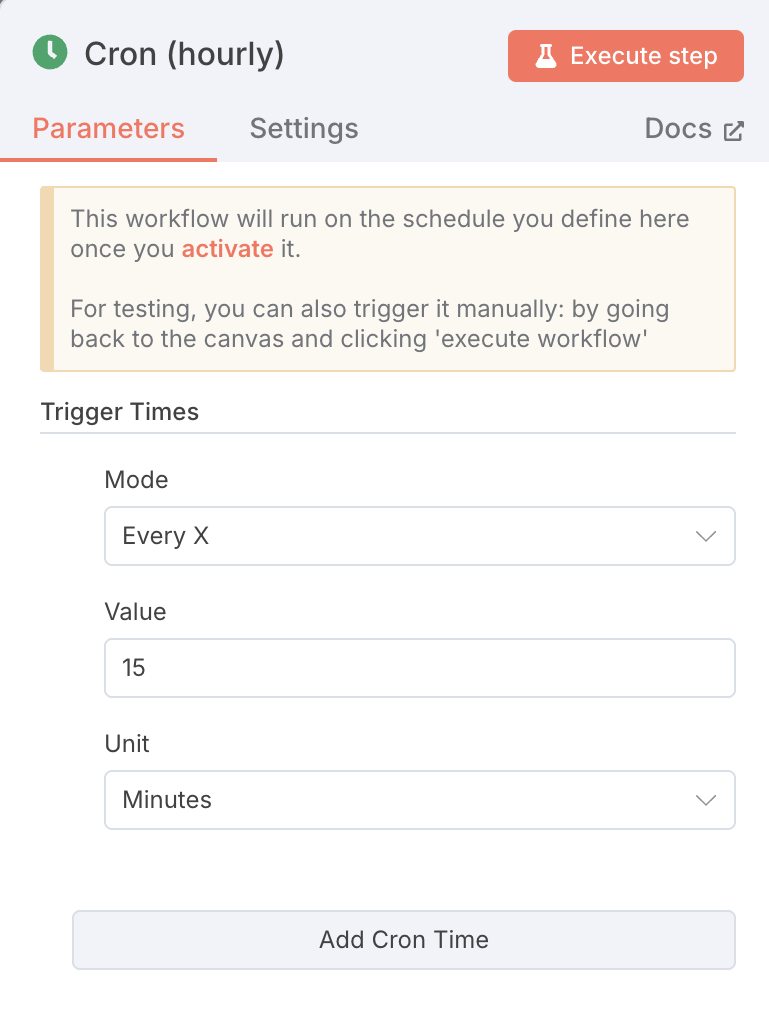Используйте код Cron в n8n для запуска рабочего процесса через заданные интервалы времени.