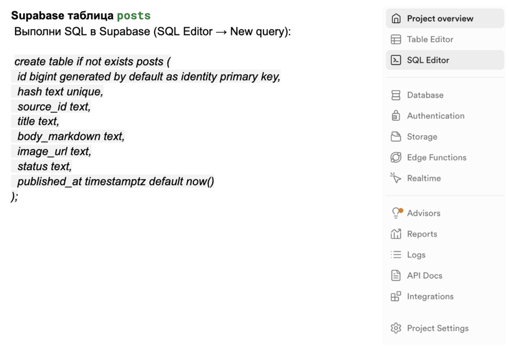 Выполните этот SQL-код в Supabase (Редактор SQL → Новый запрос):