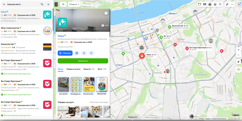 | Состав / Форматы | Текстово-графические объявления в поиске, баннеры и видео в РСЯ, динамические объявления. | Карточка организации: контакты, фото, услуги, цены, отзывы, кнопки связи, онлайн-запись. |