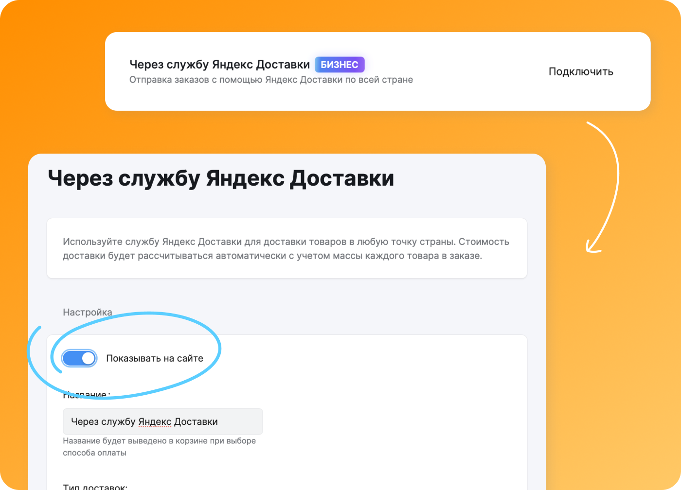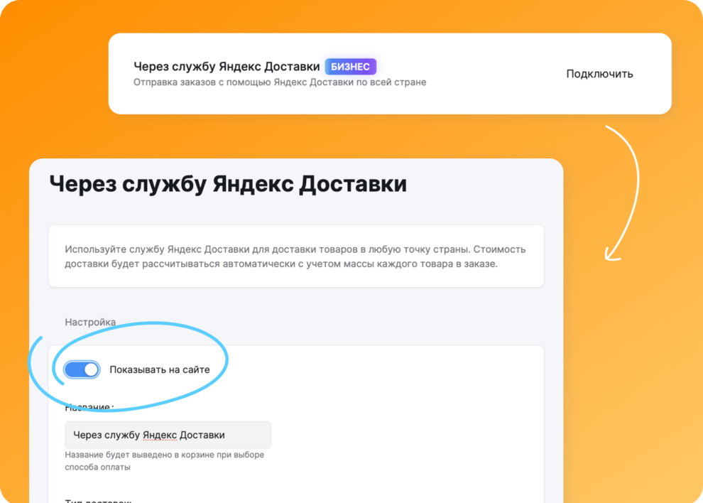 • Чтобы способ доставки отображался в корзине, включите свитч «Показывать на сайте».