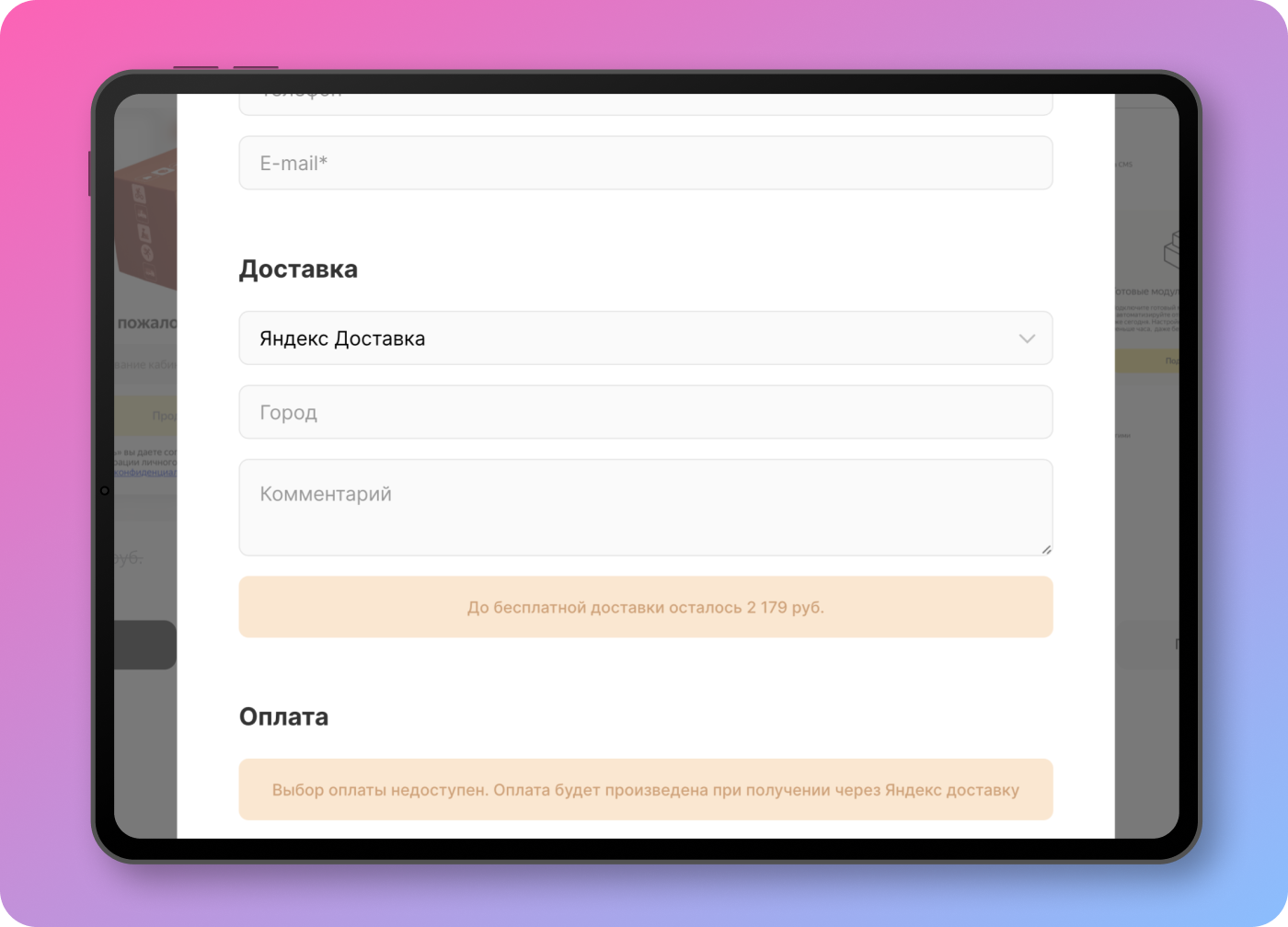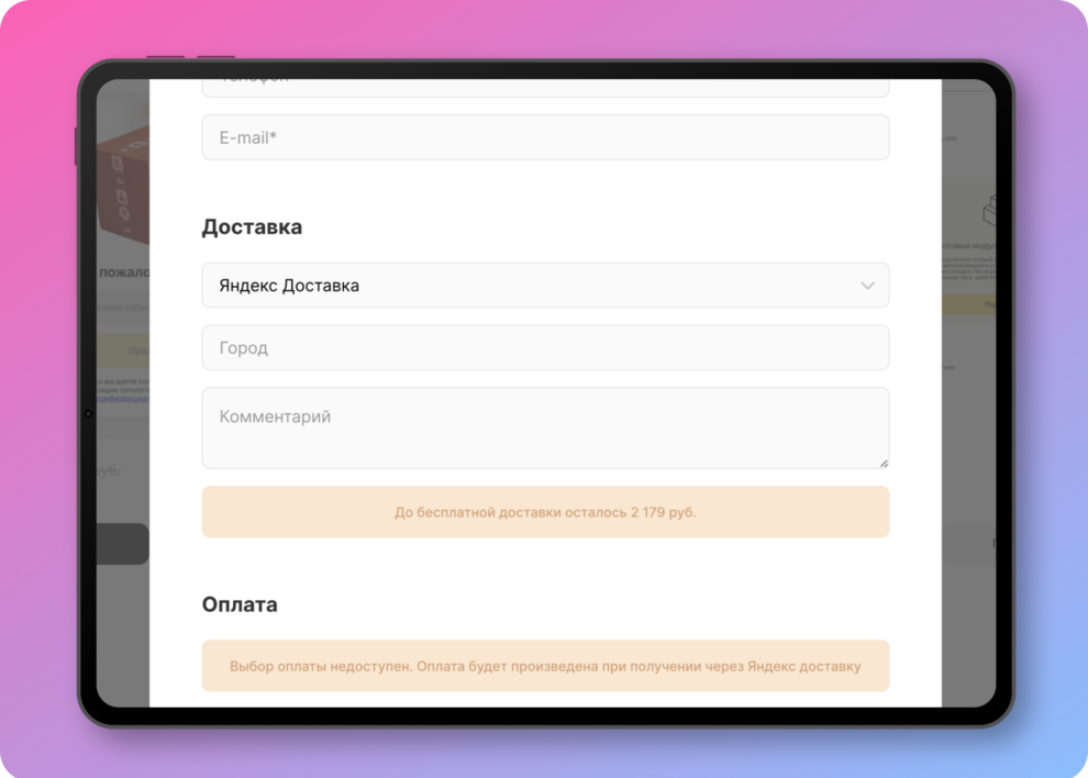 • Использование наложенного платежа и автоматическая отправка заказов в Яндекс Доставку