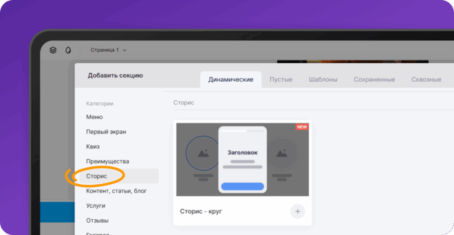 Нажмите на кнопку “+ Добавить секцию”, либо на значок "+" между секциями. На вкладке “Динамические” в левом боковом меню появилась новая категория “Сторис”.