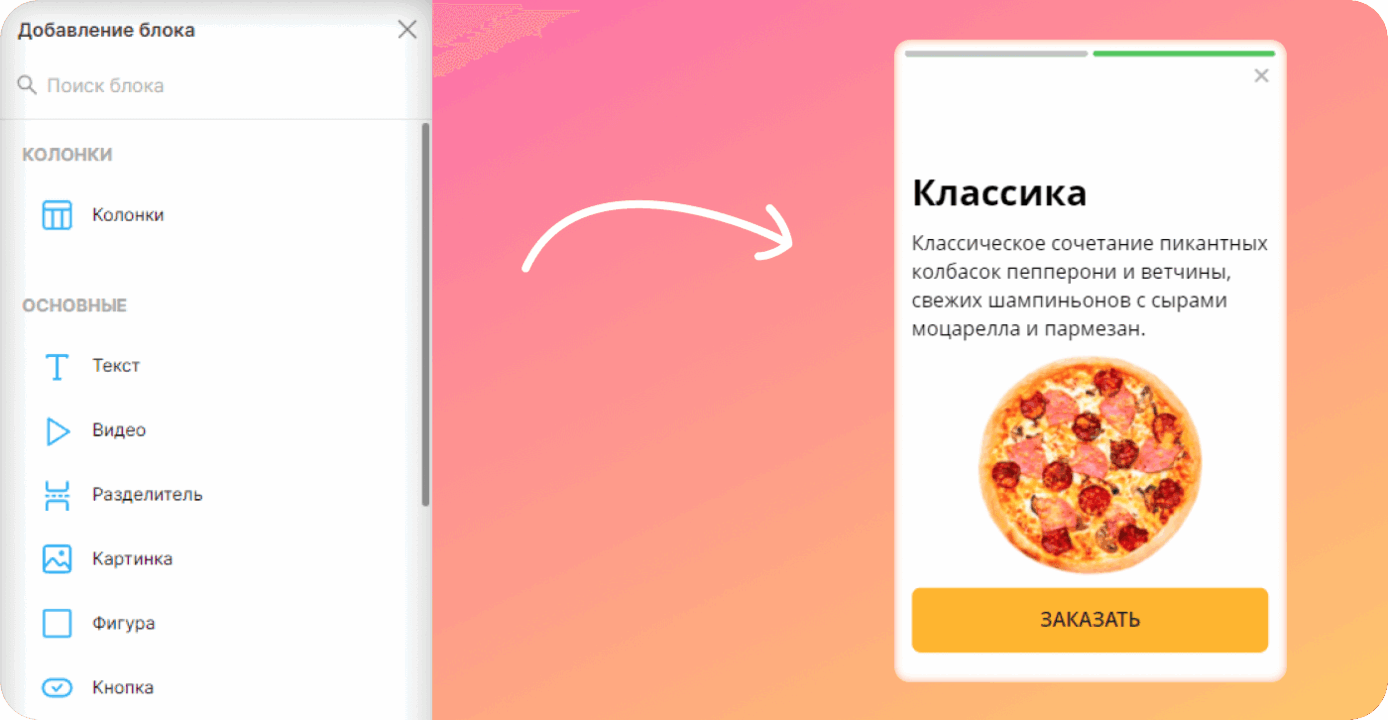 Размещайте в сторис свои заголовки, текст, кнопки и любой блок доступный в конструкторе.