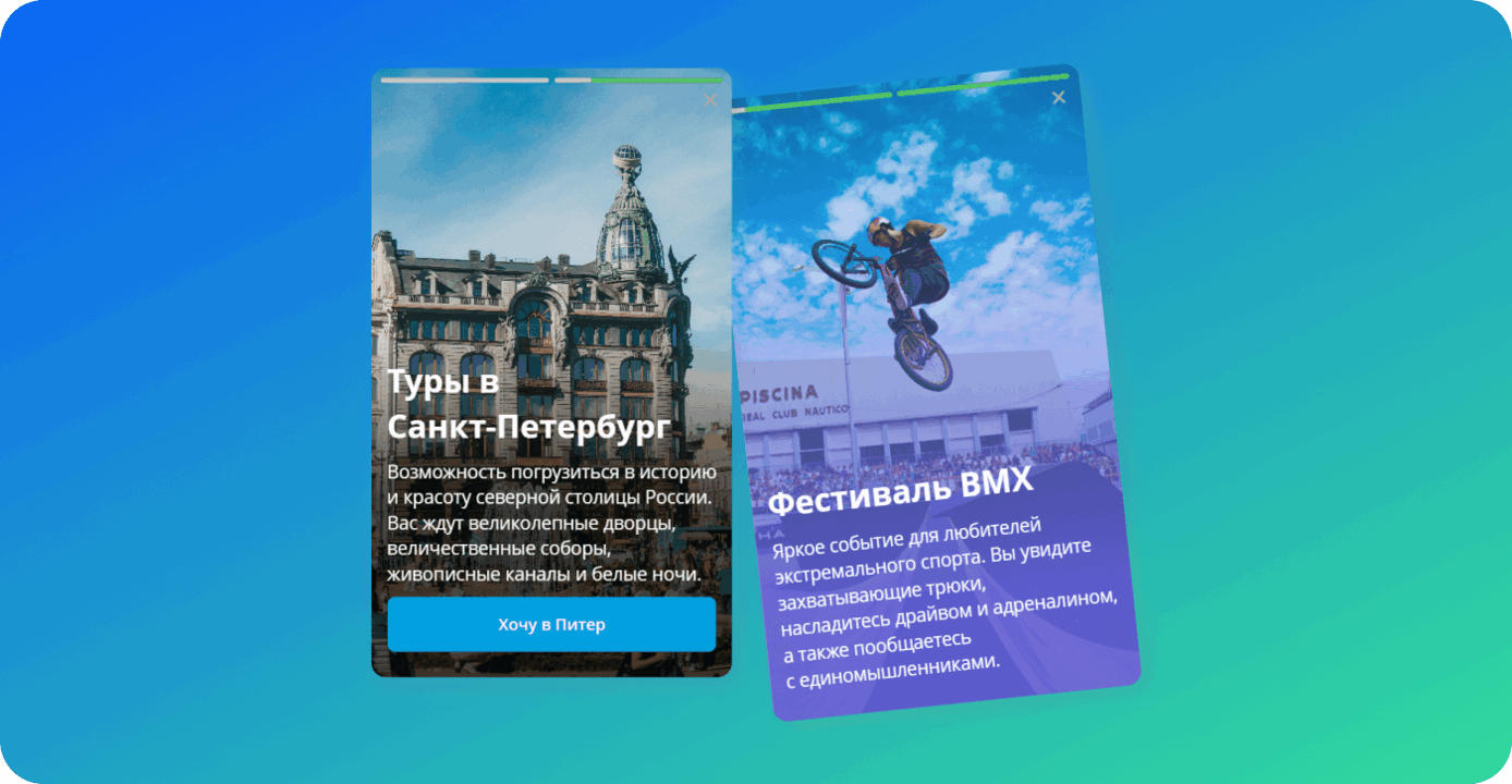 Вы можете настроить автоматическое открытие всплывающего окна со Сторис на любое из событий: