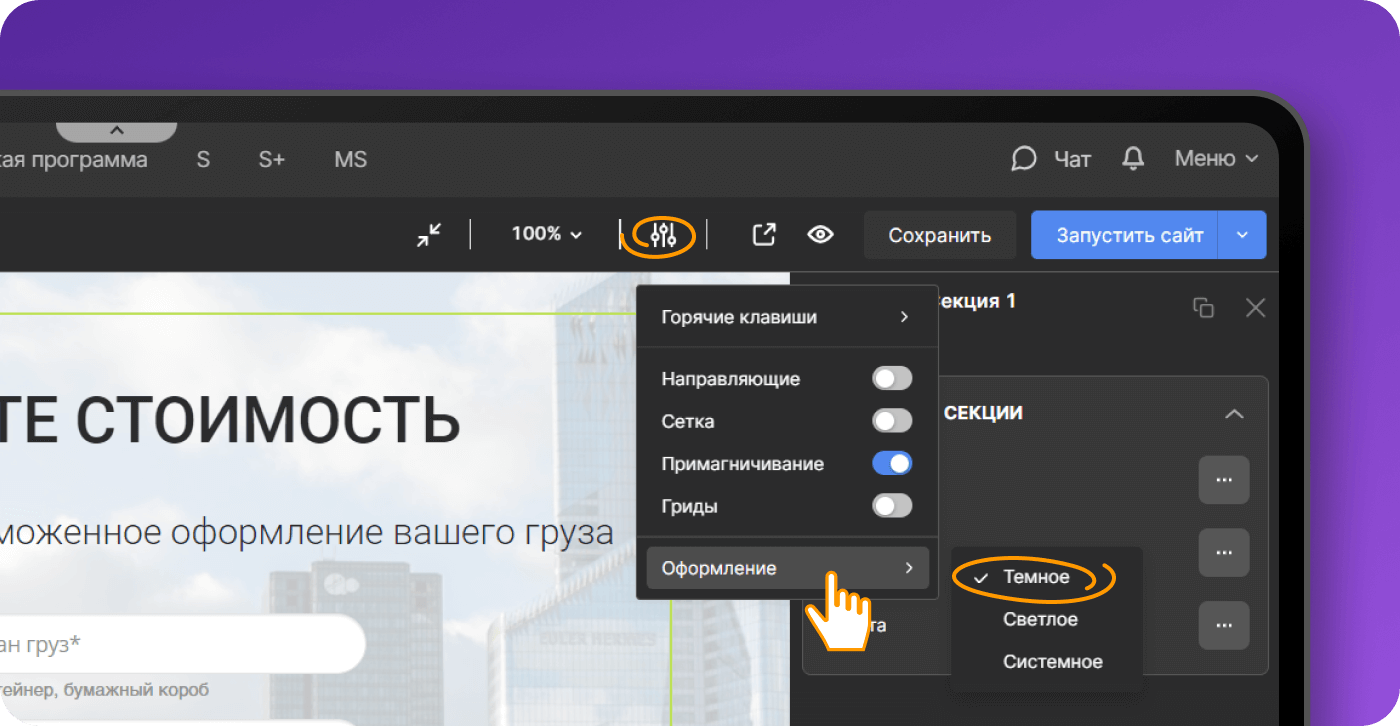 Тёмная тема в редакторе сайтов переводит все меню и настройки в тёмный режим.